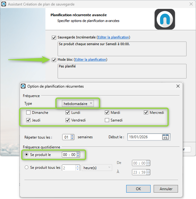 - « Se produit tous les » : Permet d’indiquer plusieurs sauvegardes par jour dans une intervalle définie