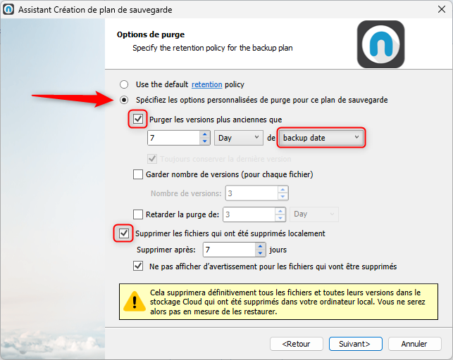 - Sélectionnez « Purger les versions plus anciennes que » et renseignez le nombre de jours/semaines/mois convenus contractuellement. Attention à sélectionner « Backup date ».