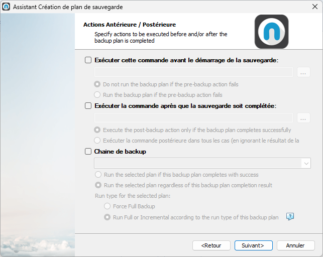 - L’option « Chaine de backup » permet d’automatiquement commencer un plan de sauvegarde suite à un autre.